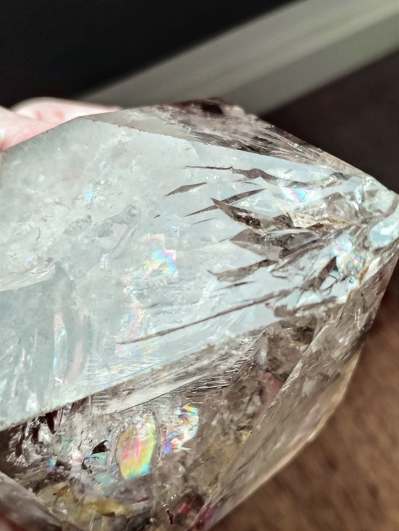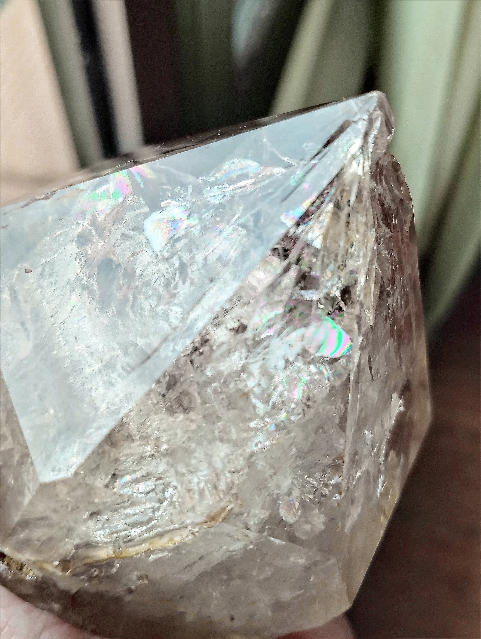 This is a high-quality crystal with excellent clarity and remarkable internal brilliance. Inside, you can see multiple crystalline layers, delicate natural formations, and numerous areas with a rainbow effect (flash), visible from different angles and especially under natural light.