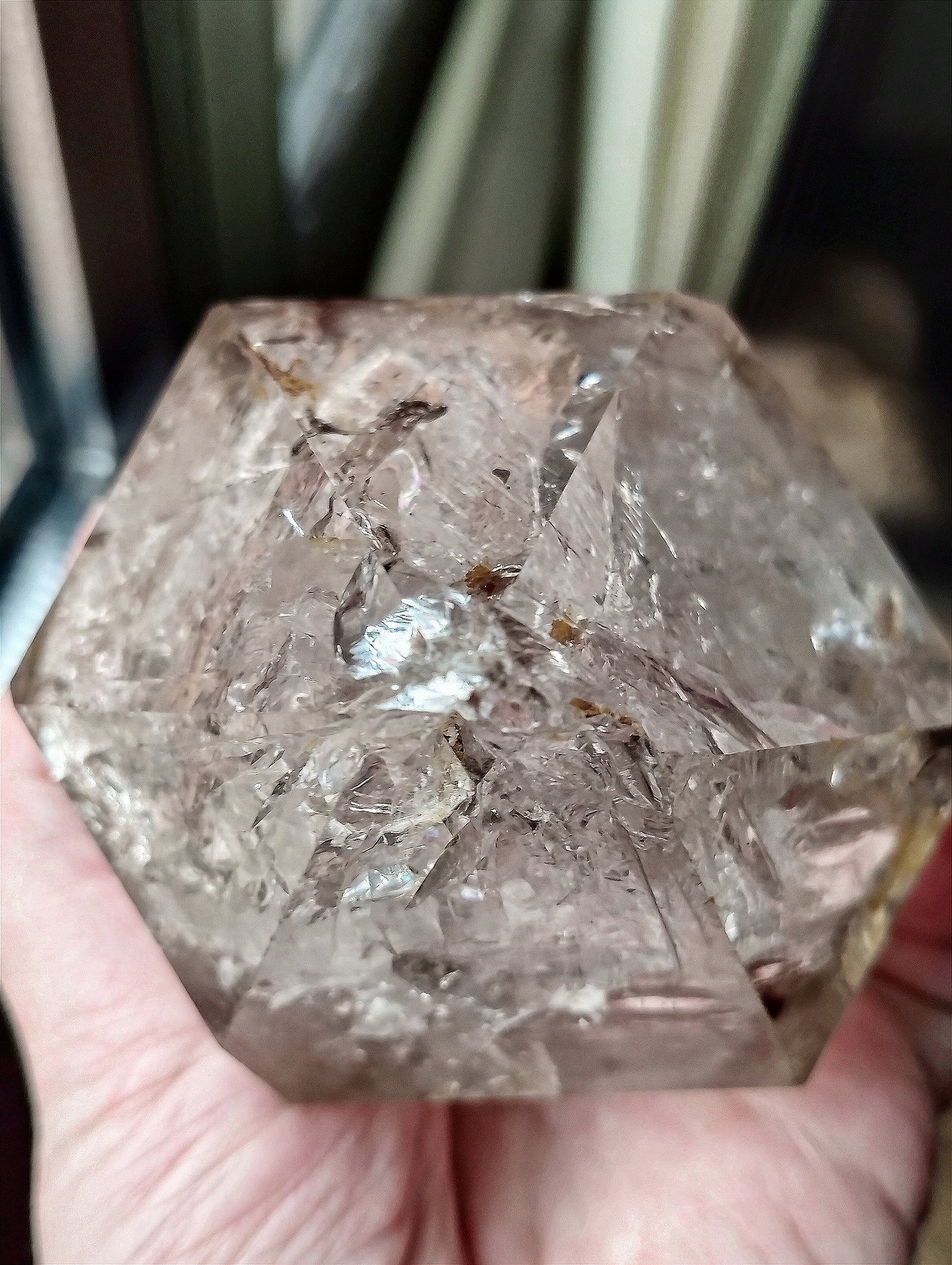 Large natural quartz tip with a perfectly defined hexagonal shape and a solid, stable structure. It can be placed directly on a table or shelf without the need for additional support.