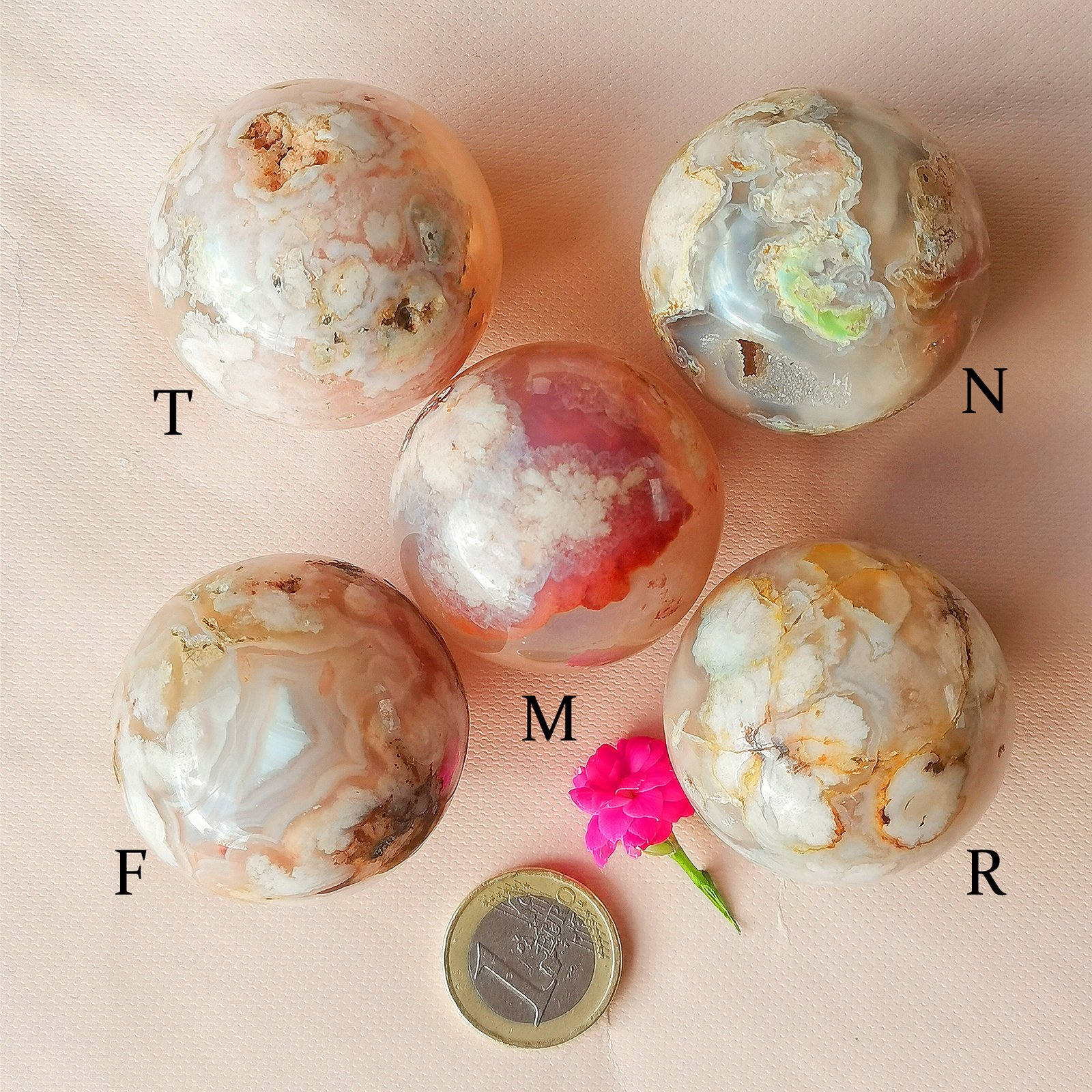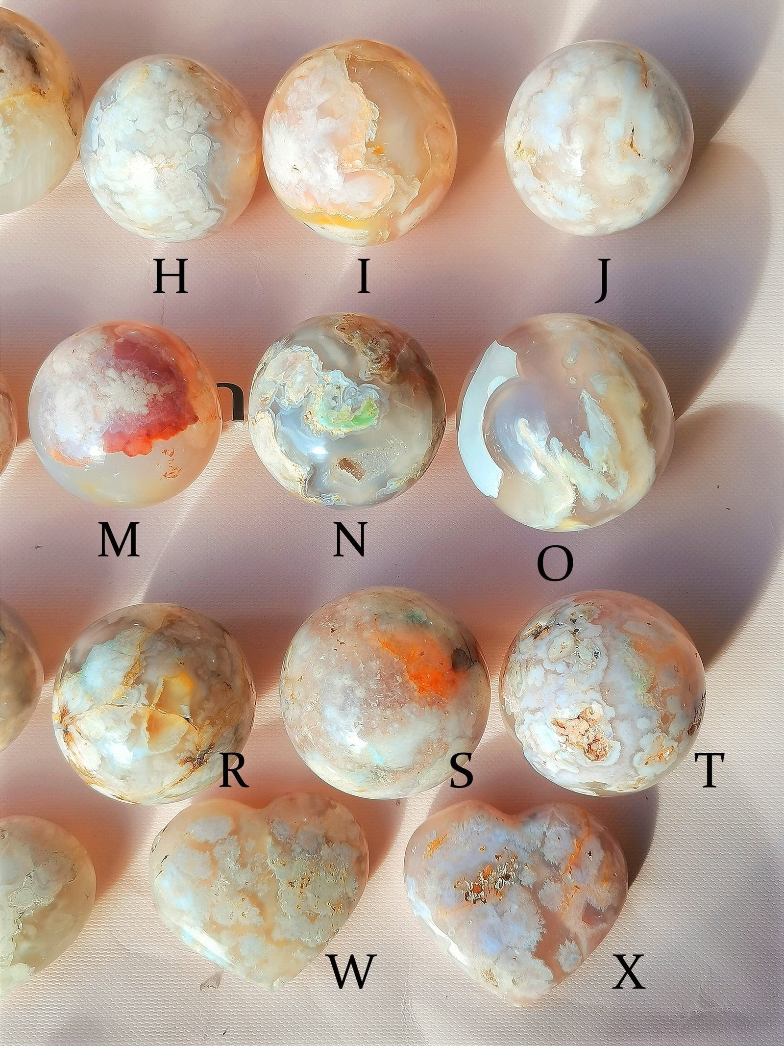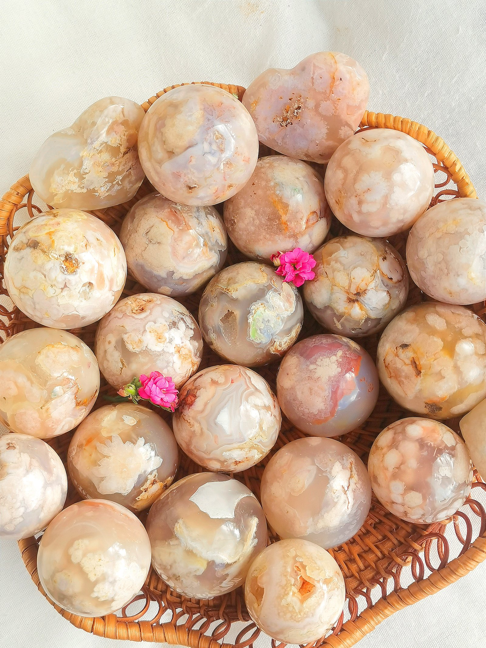 Natural pink sakura agate, carefully polished, available in sphere and heart shapes.