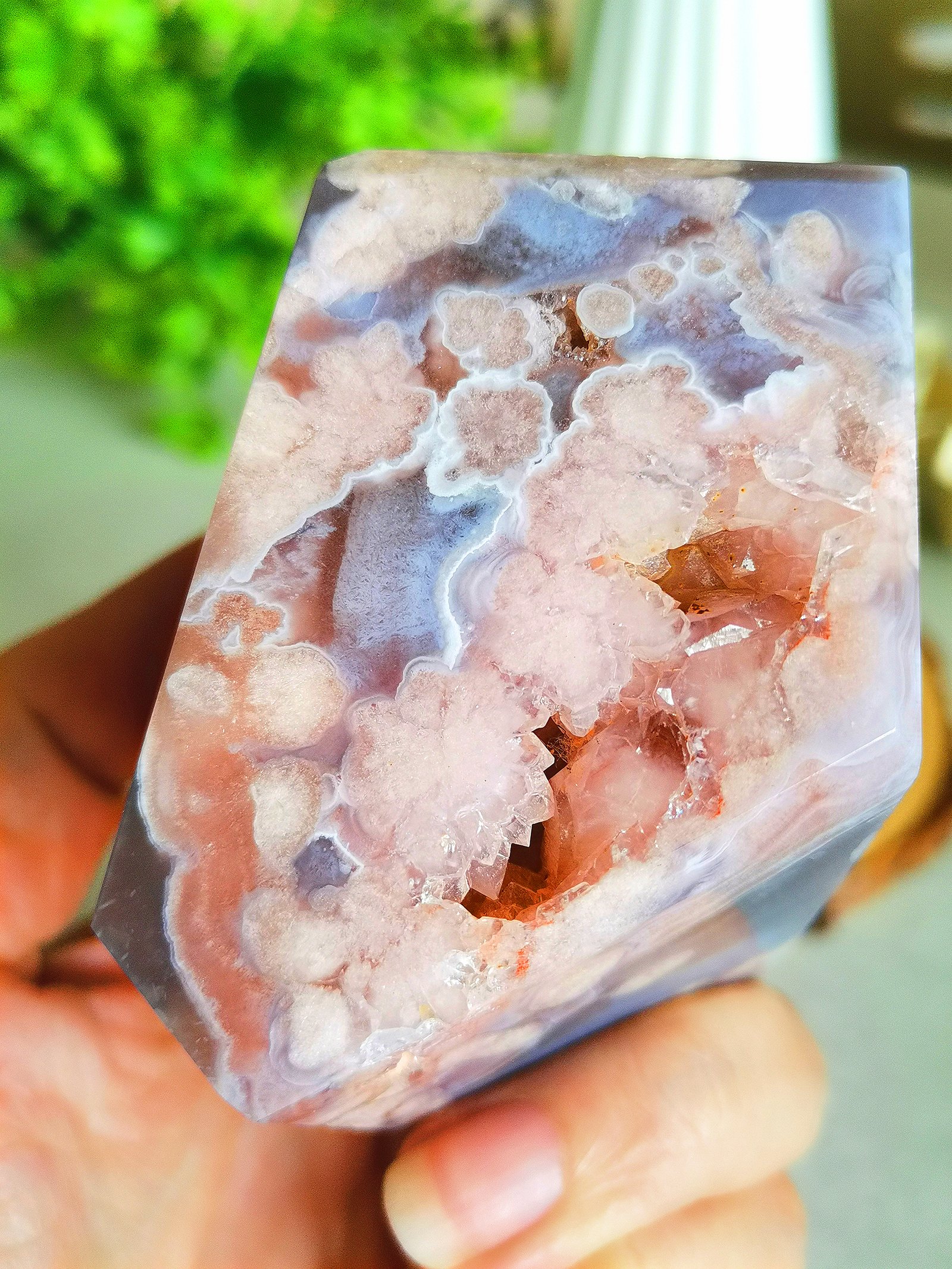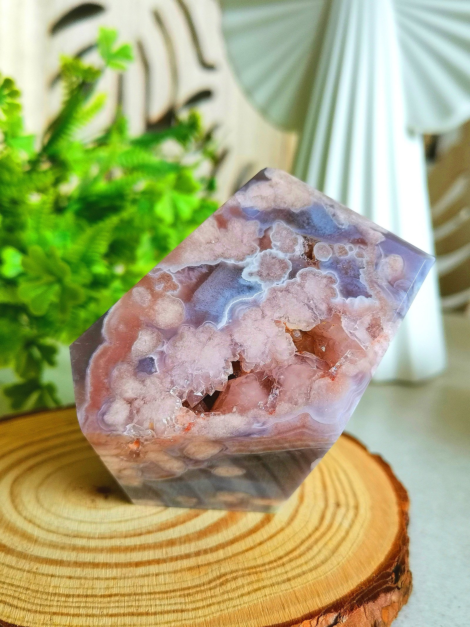 Natural Polished Blue Sakura Agate · Display Stone with Pink Druse · Multifaceted Decorative Collectible Piece