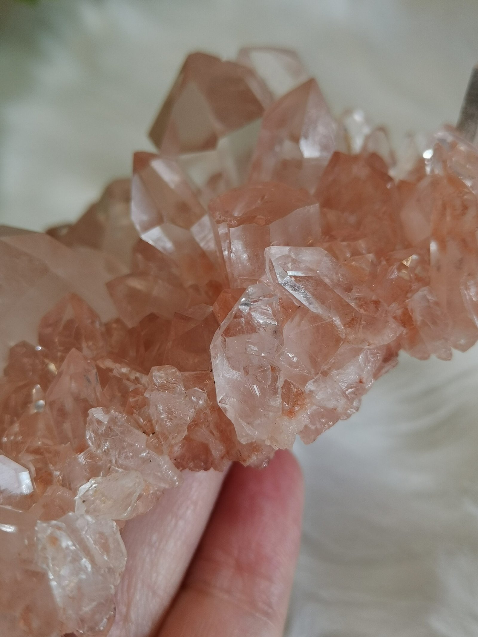 Racimo de Cuarzo Rosa natural. Los cristales son totalmente transparentes, sin inclusiones ni impurezas. La base es fina, realzando la delicadeza de cada cristal. Su tonalidad rosada es intensa y brillante, haciendo de esta pieza un ejemplar único y muy especial, ideal para colección o decoración.