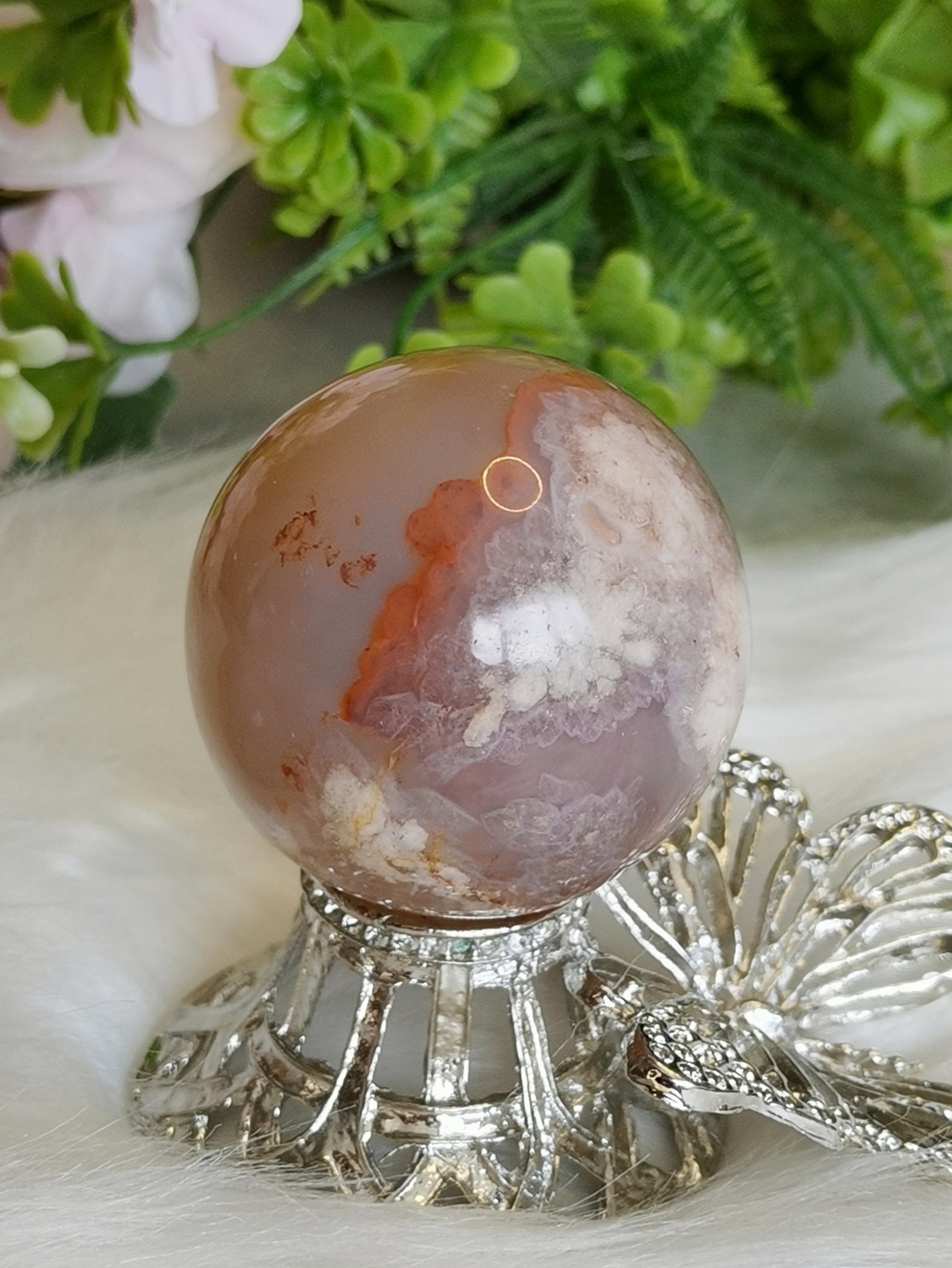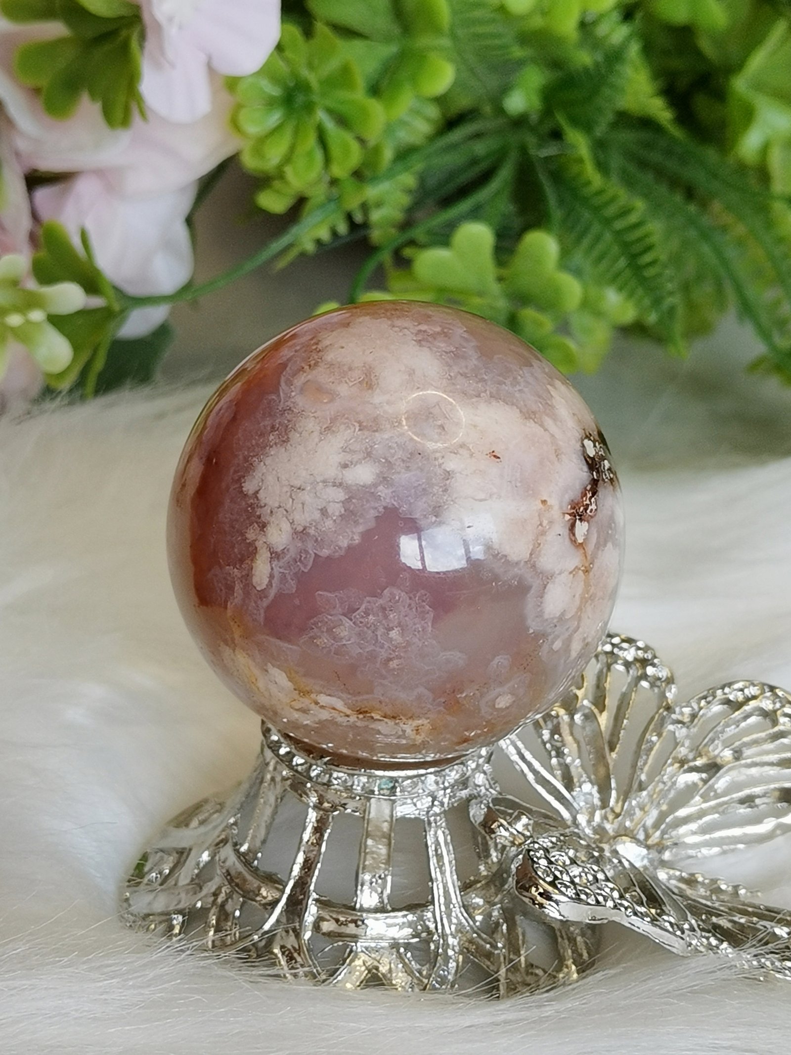 🌸Es una esfera de ágata sakura natural poco común, con presencia de tonos rojizos y vetas naturales que forman dibujos similares a flores de cerezo.