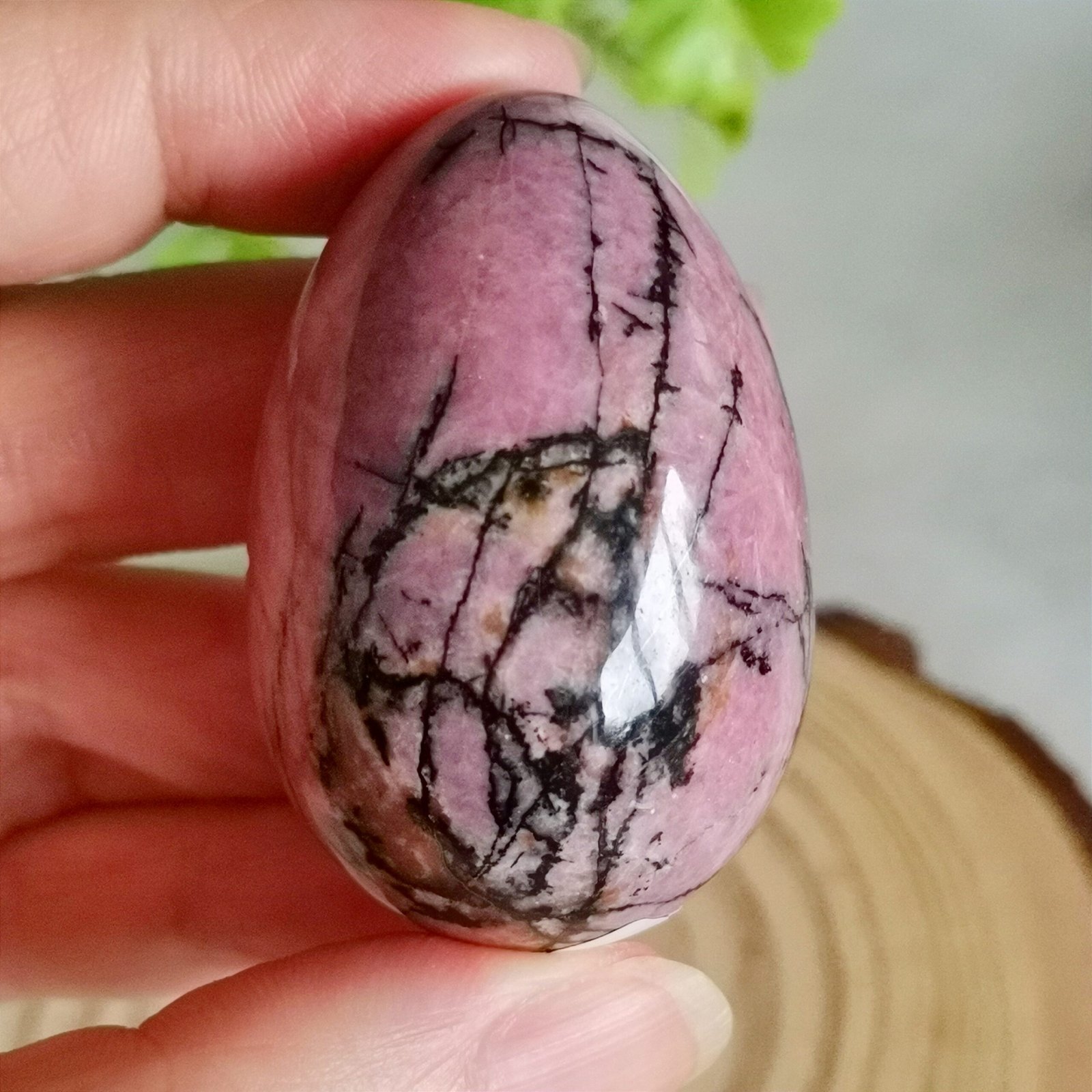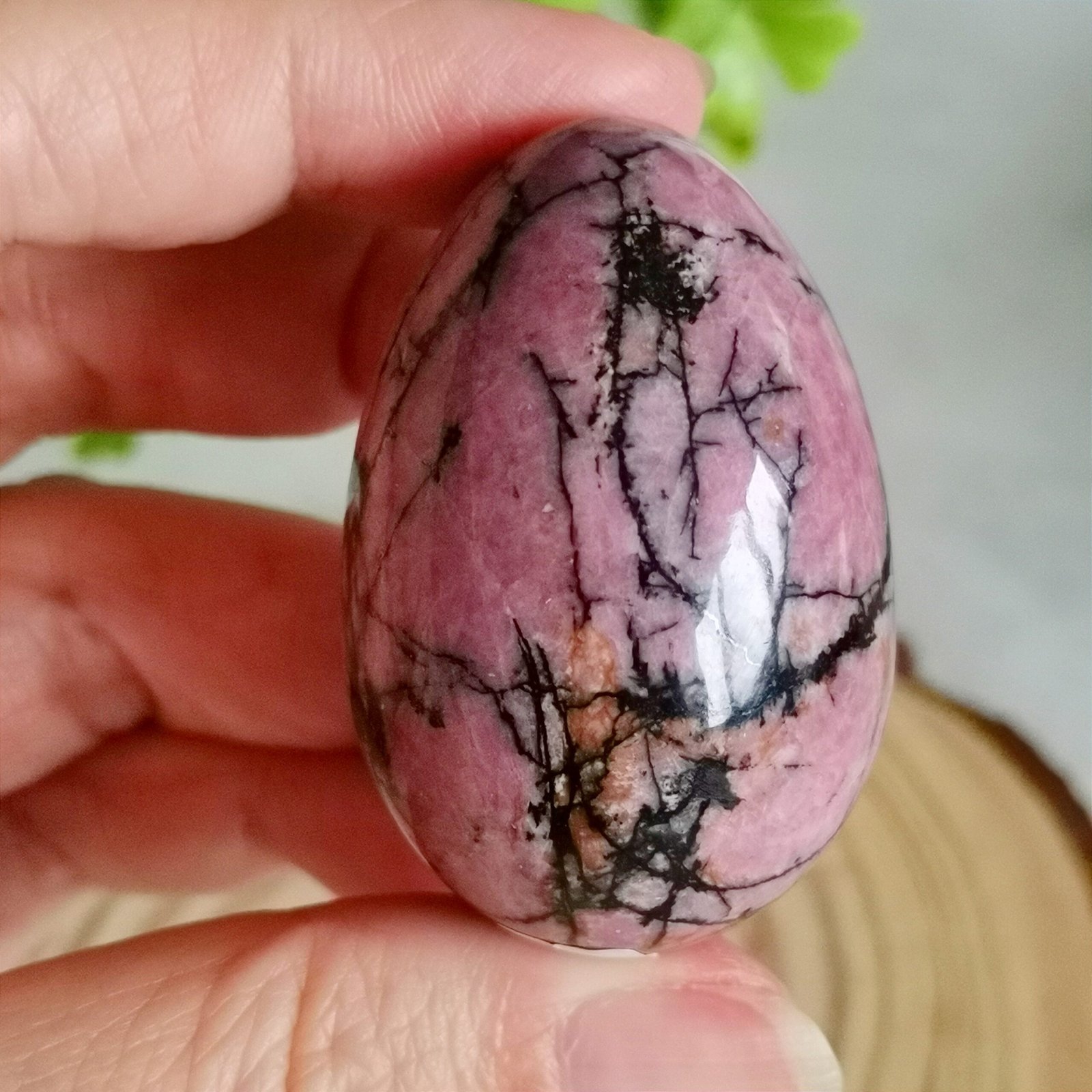Huevo de Ágata Rosa – Piedra natural decorativa con vetas negras irregulares.